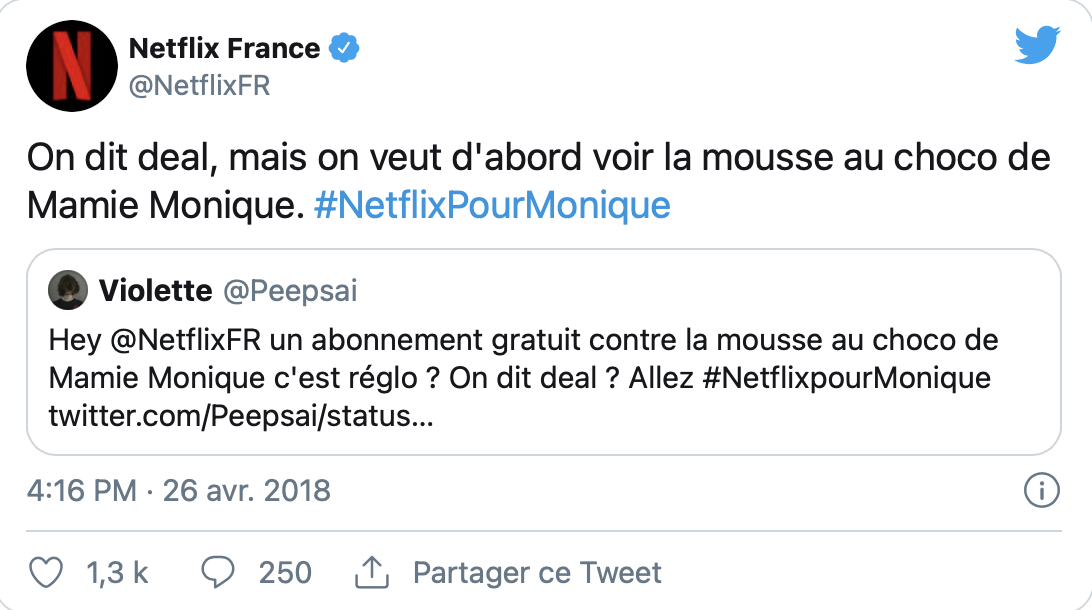 Une stratégie bien rodée : Netflix sait créer l’engouement avec des posts et réussi régulièrement à générer énormément de réactions d’internautes autour de ces publications. Ainsi, il faut entretenir le lien avec le consommateur et la stratégie de Netflix fonctionne. Les internautes donnent leurs avis sur les séries et films, mais personnifie aussi l’entreprise en lui donnant des petits surnoms tels que « Néné » repris par le CM lui-même.