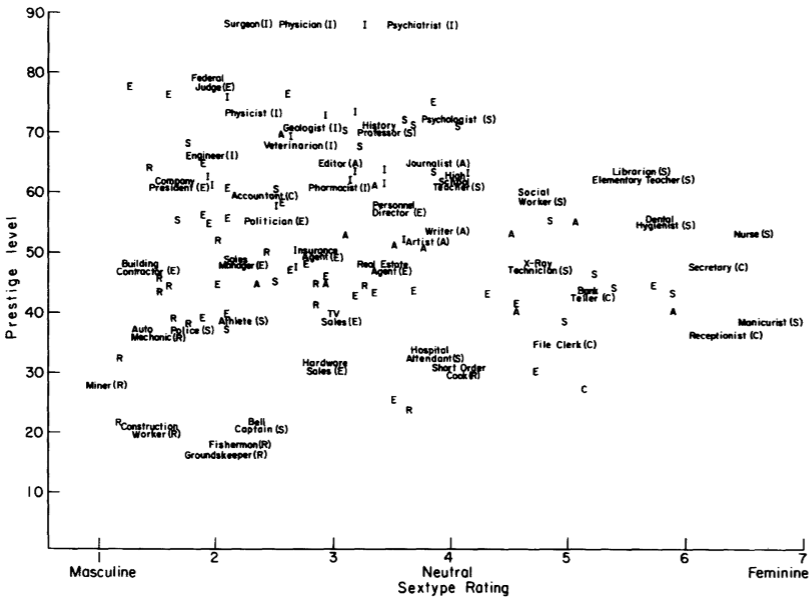 An explanation of why sextype and prestige seems to be more important than interests is shown by the study of Shinar (1975). He presents 129 occupations which were regrouped according to the Holland’s theory of 6 types of personnality : investigative, social, artistic, realistic, conventionnal and enterprising personnality. Results had shown that each interest cover a particular level in the two axis of feminity/masculinity and prestige. For example, investigative personnality is associated with a very high level of prestige and more masculine degree than feminine.